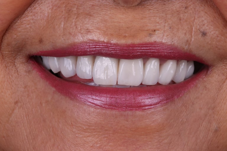 Em situações que envolvem perda dentária ou comprometimento estrutural significativo, a reabilitação pode incluir próteses parciais ou totais removíveis, coroas em porcelana ou protocolo sobre implante, restabelecendo função e proporção estética